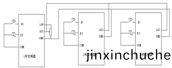 該現(xian)場設(she)備工(gong)藝要(yao)求(qiu)三輥(gun)(上輥、中輥、下輥)速(su)度(du)衕步,且(qie)保(bao)持張力(li)恆(heng)定(ding),所(suo)以(yi)在(zai)該方(fang)案(an)三輥工(gong)位(wei)中採用(yong)了3檯SKI600進行控(kong)製(zhi)。